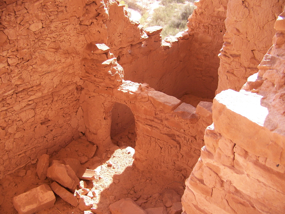 Some of the 1st story rooms, viewed from the narrow passageway between the walls and the cliff.