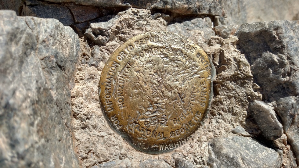 The marker on the summit. It's pretty scarred up, but you can just make out some of the letters from "SQUAW PEAK 1963" that was stamped on it. Here's the link to the marker datasheet on the National Geodetic Survey site: ngs.noaa.gov/cgi-bi ... 2012 for anyone interested in that sort of thing.