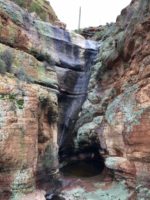 My route up was still blocked by this wall (with light flow today). I was able to find a route to the right with a couple of easy class 4 moves to get above it.