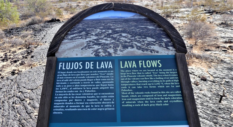 The place where we are located at the moment is a large lava flow that is called "Ives" being the largest in the Pinacate volcanic shield. The boiling river of lava can reach up to 2,102 F. The basalt is composed of iron and magnesium.