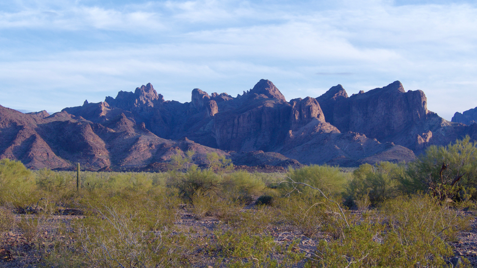 The northwest corner of the Kofas between Kofa Queen, Tunnel Mine, Surprise, Twin Spire, Oak, and Tunnel Spring Canyons offer up some impressive peaks and ridges rising 2000-2500 feet above the desert floor. None of these has a name. Signal and the more common Kofa peaks are out of the picture on the right.