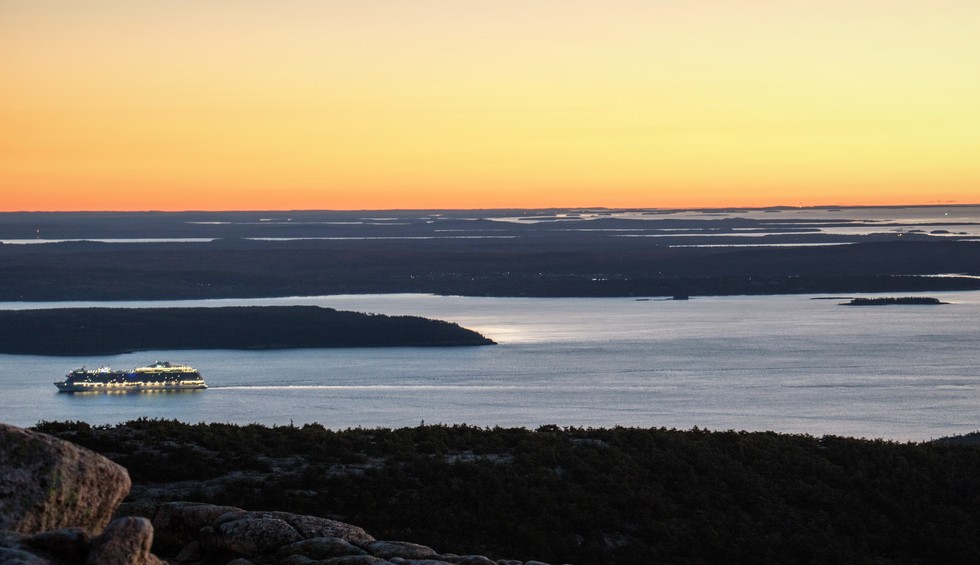 CADILLAC MOUNTAIN. The next morning it was still cold and windy but clear on Cadillac Mountain as we wait for the sun to rise in the east. So that's what's over here since we didn't get to see it yesterday morning. Pretty cool watching the cruise ship come in.
