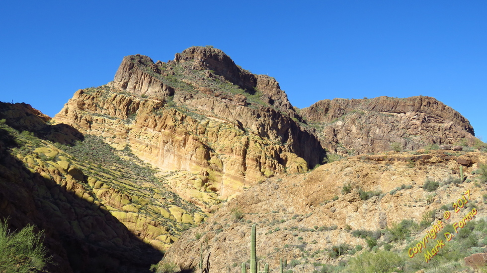 Peak 2662 from the southeast. On my first attempt I made it up to the ridge on the right but encountered a cliff in between. My second attempt I reached a point just above the shadow on the left.