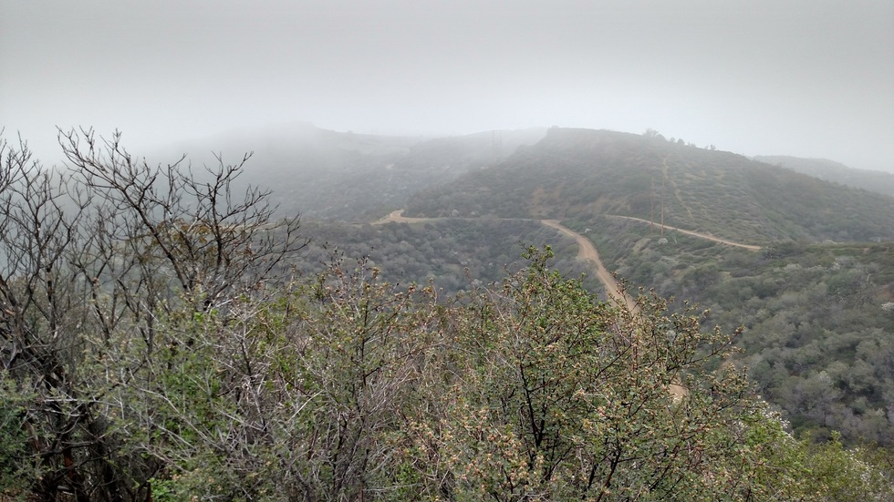 Looking to the North from the radio tower toward the junction where I turned around. The Temescal Ridge Trail is the higher coming in from the right. The trail from where I took this picture actually heads off to the left and then goes around the hill ending up going off the right side of the picture before coming back to the junction. The other trail is the Trail Canyon Fire Road which heads down to Michael Lane in the Palisades Highlands.