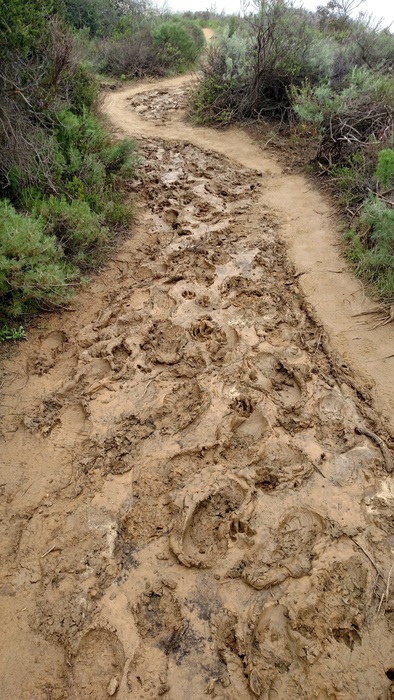 More mud. I stayed on the less muddy part myself. I've done this trail when it was very muddy everywhere and the sticky, slippery mud accumulated on my boots until each boot weight several pounds and there was no friction with the ground whatsoever. This time it was much better as there were only a handful of muddy spots and each had an solid side path.