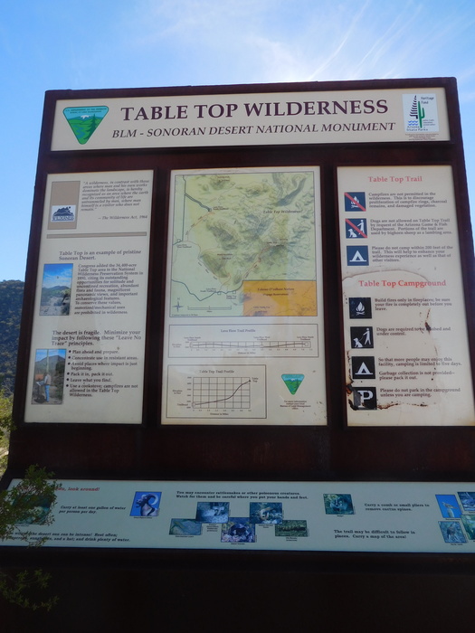 Sign at the trailhead. Readable if you view full resolution. Words on the left panel: "Table Top is an example of pristine Sonoran Desert. Congress added the 34,400-acre Table Top area to the National Wilderness Preservation System in 1990, citing its outstanding opportunities for solitude and unconfined recreation, abundant flora and fauna, magnificent panoramic view, and important archaeological features."