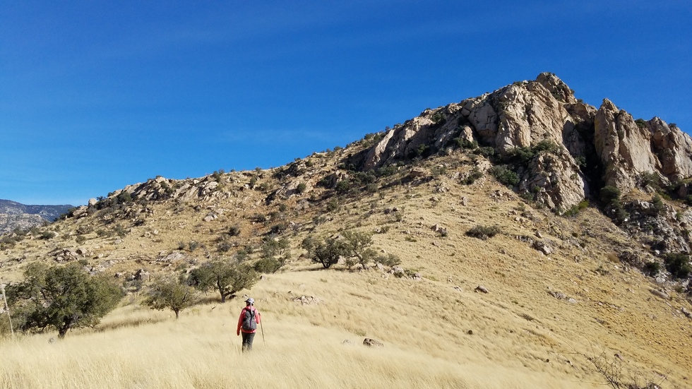 Sirena explores the saddle below the summit. We took the gully to the north end of the mountain down for a more sporty and fun route out.