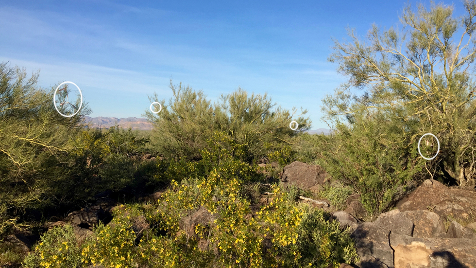There were ribbons in the trees surrounding the BM. RM#3 and #4 were directly below ribbons. I searched under the other two ribbons and came up empty. I found out later that the original locations were much farther away, but I'm guessing they were aligned with the ribbons.