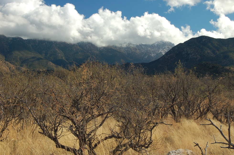 Back at trail head, Mount Wrightson and Florida Ridge in clouds and snow.