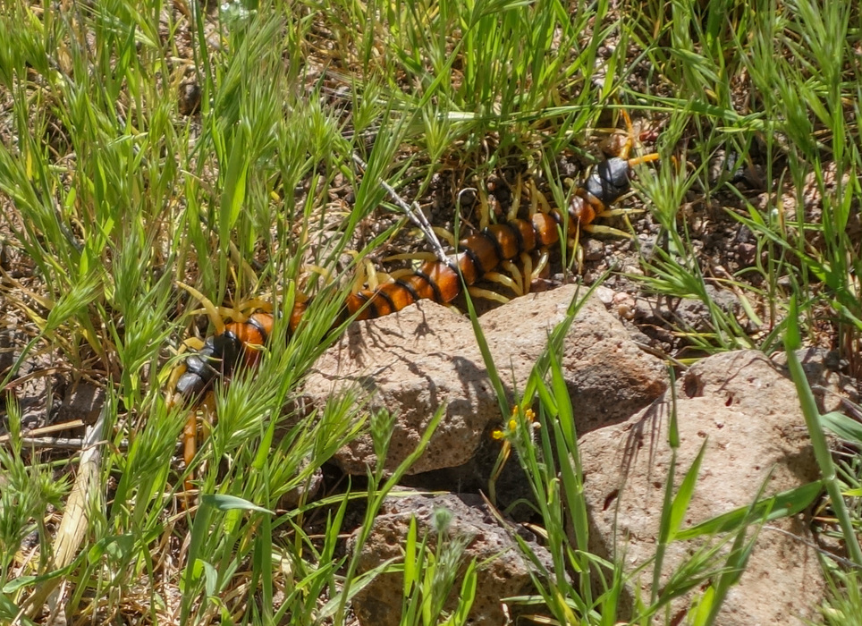 My first encounter with an Arizona Giant Centipede which can grow up to 8 inches long. This guy was approaching that length. They have a pair of fang-like, venom-filled, modified front legs known as gnathopods. "Bites" can be painful, but "generally" not life-threatening to humans or larger pets. however they can be fatal to small reptiles or rodents. They also can move fairly fast which I discovered when I tried to move him out of the grass for a better photo with the tip of my trekking pole. He took a run towards my feet giving me a good scare and causing me to miss the better photo opportunity.