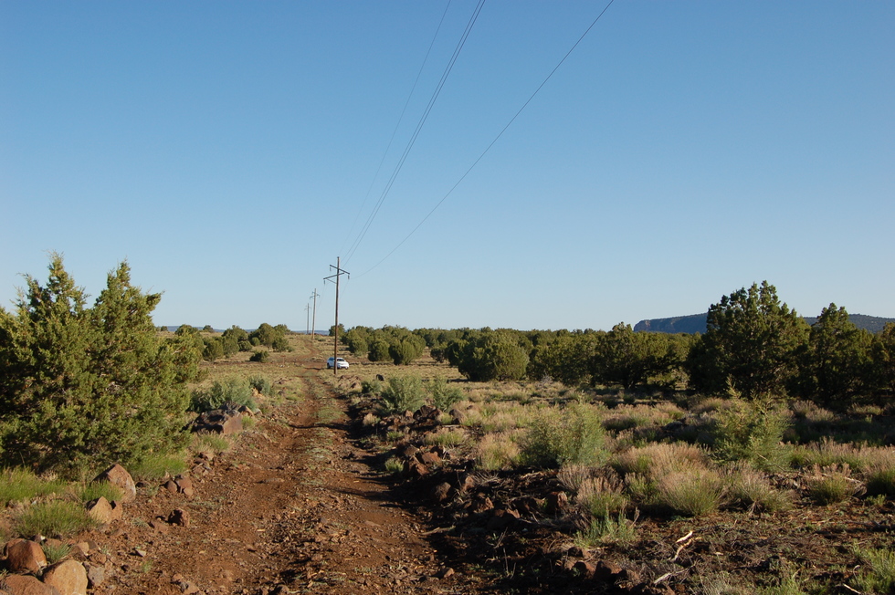 View West on Hardscrabble Mesa. Parked car at Junction of Twin Buttes Road and Power line road.