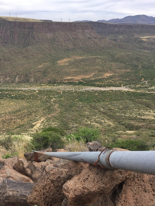 Two pipes run down nearly 1000ft from the top of the Mesa all the way down to the two pump house looking buildings.
