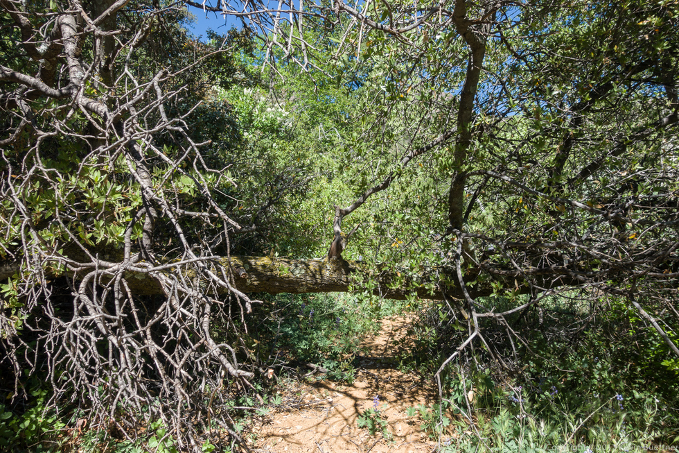 This is the first really annoying deadfall that I encountered on the trail. It's too low for me to comfortably go under (without crawling on my hands and knees) and is nearly too tall for me to go over easily. It turned out that I was able to throw a leg over it, straddle it, touch down on the other side, and then pull my other leg over.