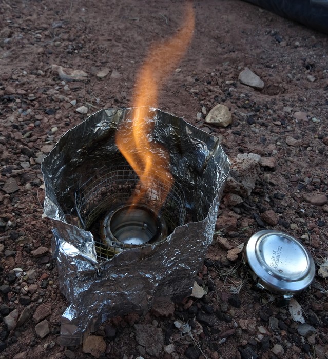 45 grams, including support mesh and windscreen. Quiet. And you can drink the fuel.