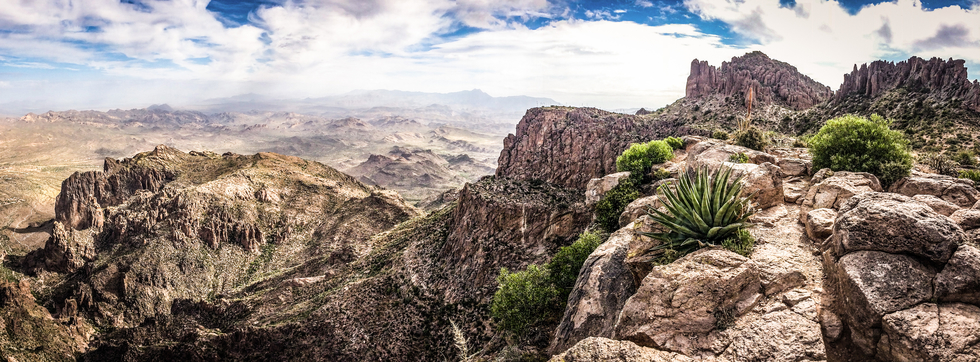 View from the Flatiron, Superstitions in foreground, Goldfield Mountains in the mid and Mazatzal/Four Peaks in the background.