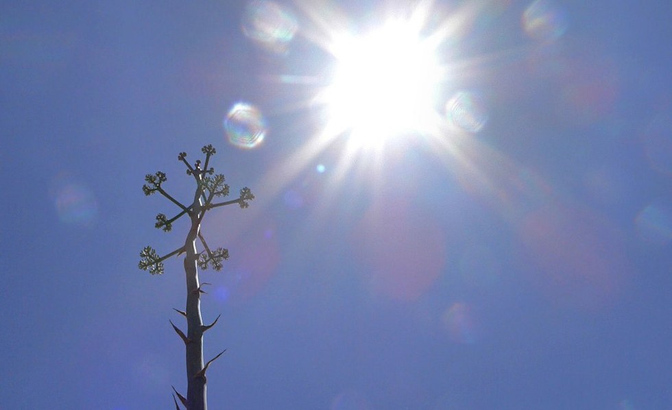 I really like the shape of this blooming stalk of cactus with the sun above.