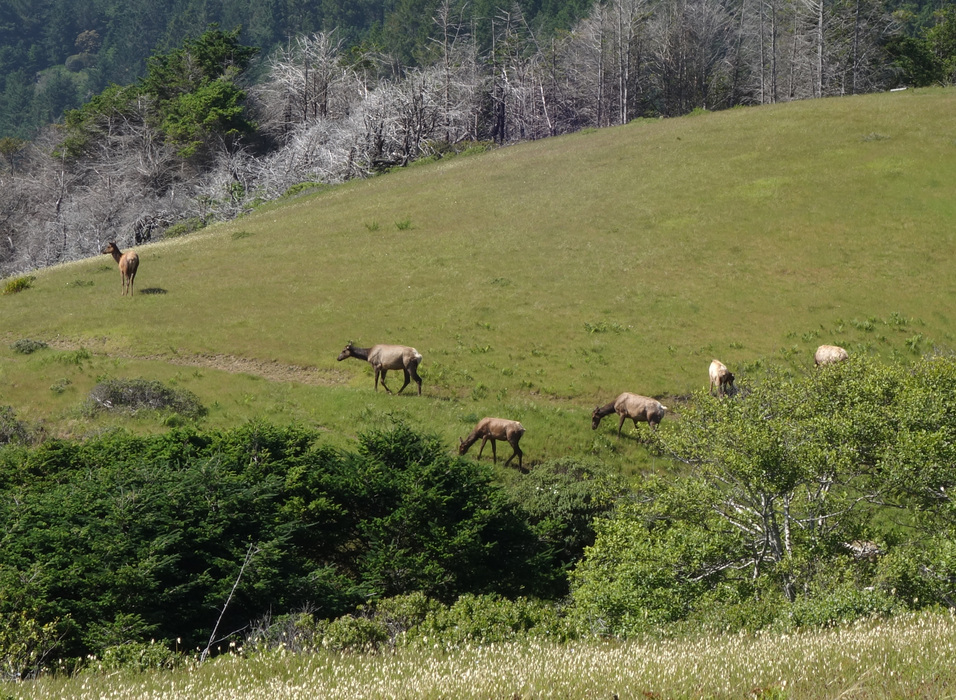 The trail follows an old road which can be seen cutting through the side of the meadow. The elk are used to people and exhibit little fear since they are protected from hunting in this state park.