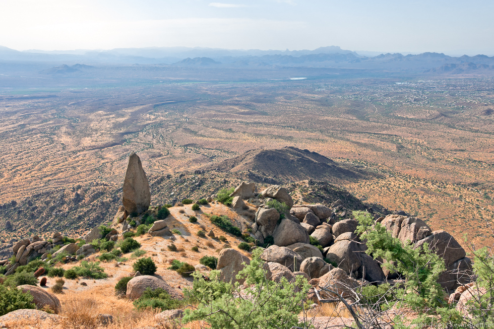 From this vantage point, above the Thumbnail Pinnacle, it no longer has a hooked shape, but instead looks more like a spire. Weaver’s Needle and the Flatiron can be seen in the distance. The large bright area in front of (and slightly to the right) of Weaver’s Needle looks like it might be a lake, but is actually a quarry. The Fountain Lake can be seen in this photo – it’s right of the quarry.