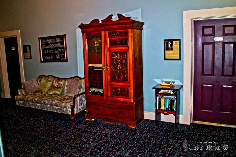 More furnishings and notice the framed photos by the doors, these are photos and a short bio of famous residents that have occupied the rooms in the past.