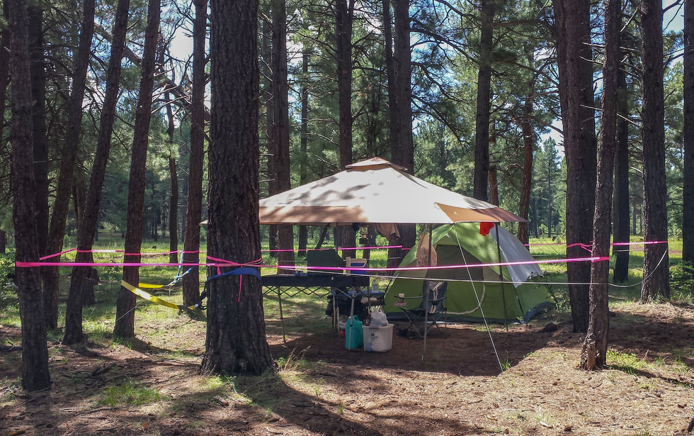 The NoNot corral. When NoNot set up his Taj Mahal camp the horses stopped hanging out at my camp and focused their attention on his camp. The pink tape, rope and tow straps strung out around his camp kept the horses out with limited success. When one got trapped inside the corral we had to drop the "fence" to let him out before he knocked down the tent.