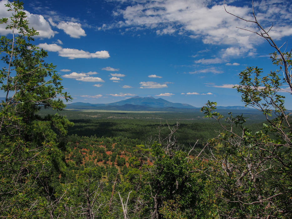 View of the San Francisco Peaks from Hill Three, the highest of the three hills. The red hill in the lower half of the photo is Indian Hill. The red color may have been the reason for its name.