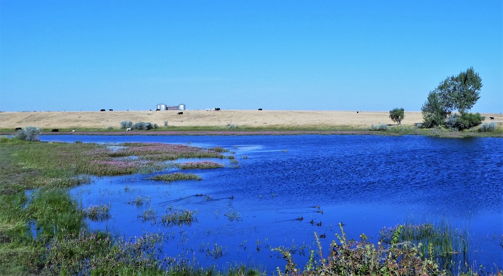 (the reservoir at my old place, we called it Marias Farms). The next day it was up and at 'em with a driving tour. Cousin Brian had to check a trough at my old place so we headed out. So many memories out here for me plus it's a lot of Romain acres and former Romain acres. My cousin Dennis farms our old place so it's nice that it stayed in the family. Well the trough was fine so it was on to the main house area where some cattle had somehow managed to get into an area they weren't supposed to be. So we had to herd them out; cattle are so dumb. Wendy commented that these cattle were much more stout than a lot of the Arizona cattle we see on the trail. Brian took us atop the reservoir. He exclaimed its the fullest he's ever seen it.