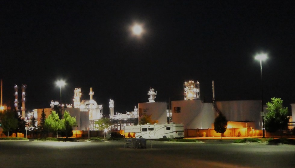 Calumet Montana Refining in Great Falls is a pretty shot at night. And as usual, my moon shots are terrible. That's the moonstar in center.