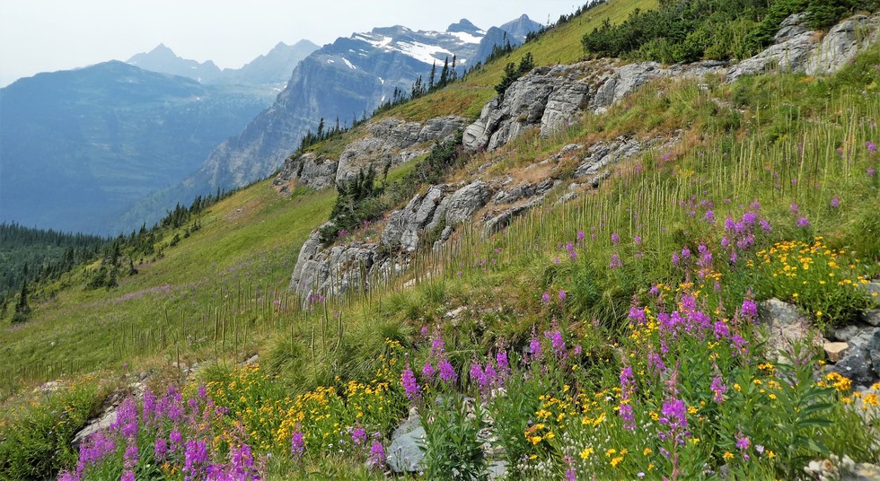 Looking past the flora along the trail including arnica and fireweed to the west and what I think is Mount Peabody. Boulder Peak is straight ahead. We will eventuall make our way above this rock line for our hike around this mountain to the hanging glacial valley to the right.