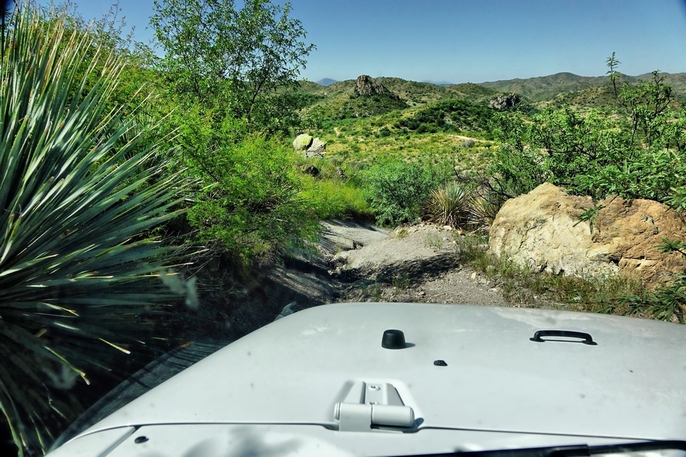 The road to the tank was fun. It is getting ready to turn and drop very steeply, eroded into a "V". got to use my lockers and electronic sway bar disconnect. At one point the Jeep was leaning heavily to the driver side but the lockers allowed it to climb right out.