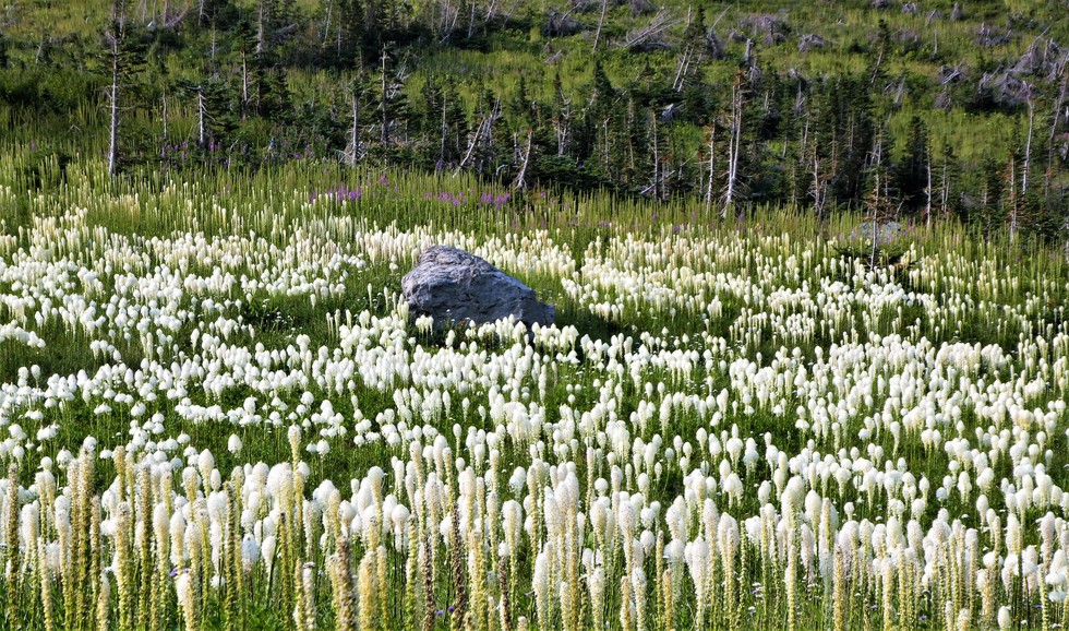 on the other side (south) of the trail there's a lone boulder surrounded by beargrass.