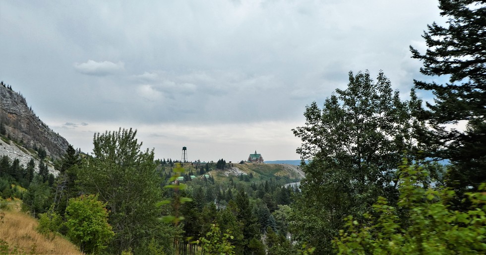 a view toward the Prince of Wales Hotel and the 100,000 gallon steel water tank which sits on a 100 ft tower steel tower. The water is used for fire protection... thank goodness they had it or the Lodge would have been gone for sure. books.google.com/bo ... alse