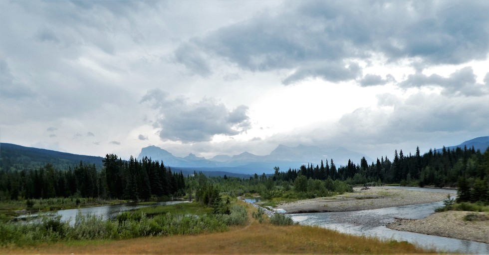 Looking south up the Belly River toward Chief Mountain, Gable Mountain and others in the background. The Belly River originates in northwestern Montana at Helen Lake (Lee was there this summer).