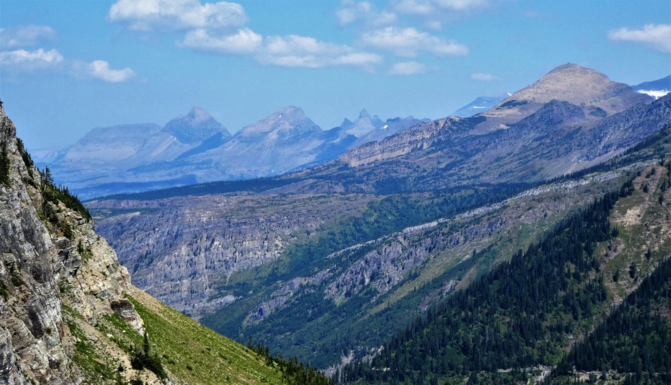 This is the view that I would like to ID those pointed mountains in the background. The peak to the right is Swiftcurrent as you can see the Lookout. Then the unknown pointy peaks (maybe Stoney Indian). Then maybe Merritt and Cleveland to their left? UPDATE: got the ID from Glacierchat: L to R - Cathedral, Kipp, Stoney Indian and Cleveland is sticking out behind Swiftcurrent.