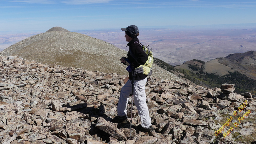 Tracey was well-dressed for the 45-degrees we experienced at the summit.