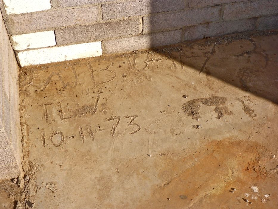 Fourth or fifth time I've been to "Graffiti Ranch", and I don't recall ever seeing this in the floor before. There is a faint name, upside down, between the initials: Possibly "Andy Baker".
