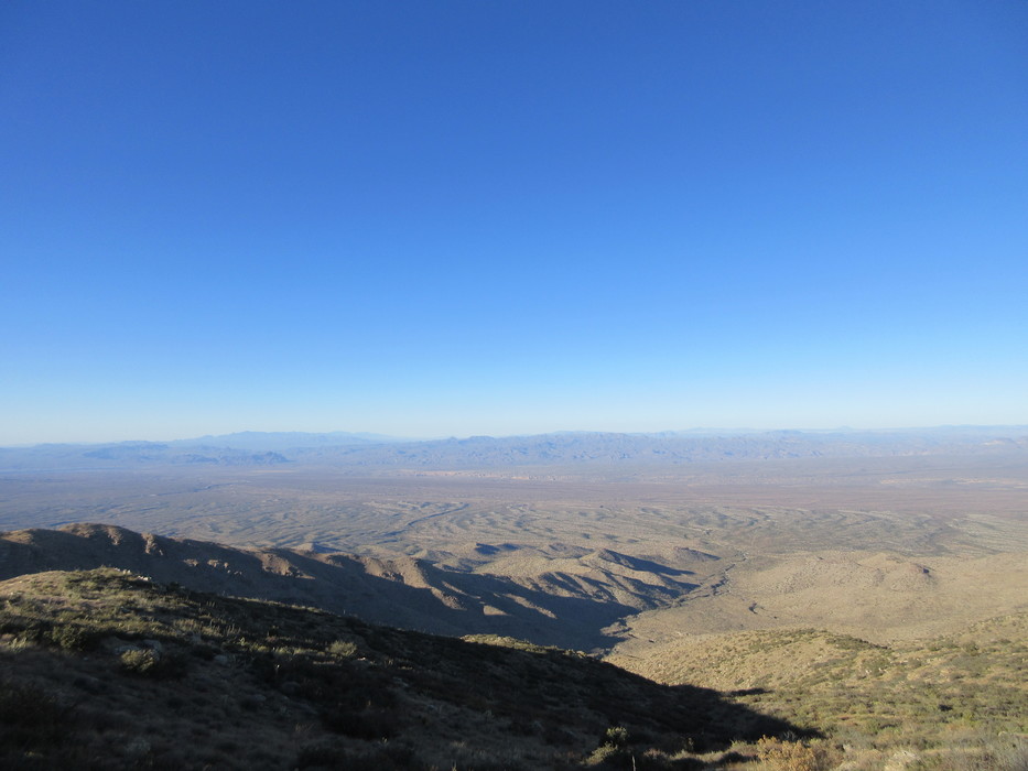Due north. Hualapai Mountains, Juniper Mountains on the horizon, and a flat topped mesa feature, which from my memory in 2010/ 2011, is visible from and located south of I-40, around Seligman, AZ.