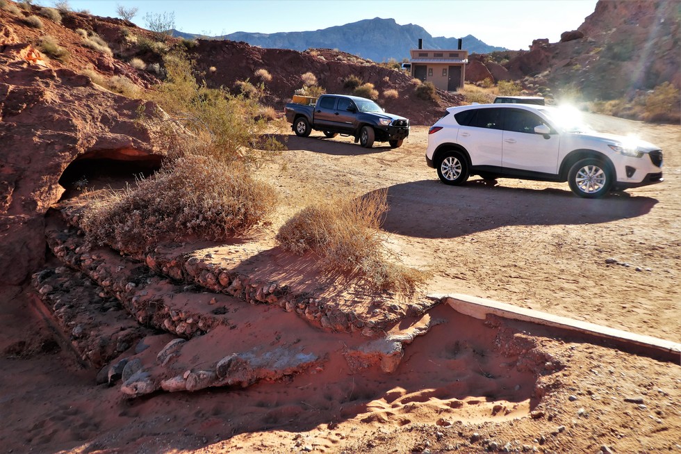 Along with the cabins, the CCC constructed a dam, and a good desert road. I don't know if this is the dam or not. On many of the stops here in the Valley of Fire State Park there are numerous nice bathrooms such as what you see here. That's Tonto there (the white vehicle).