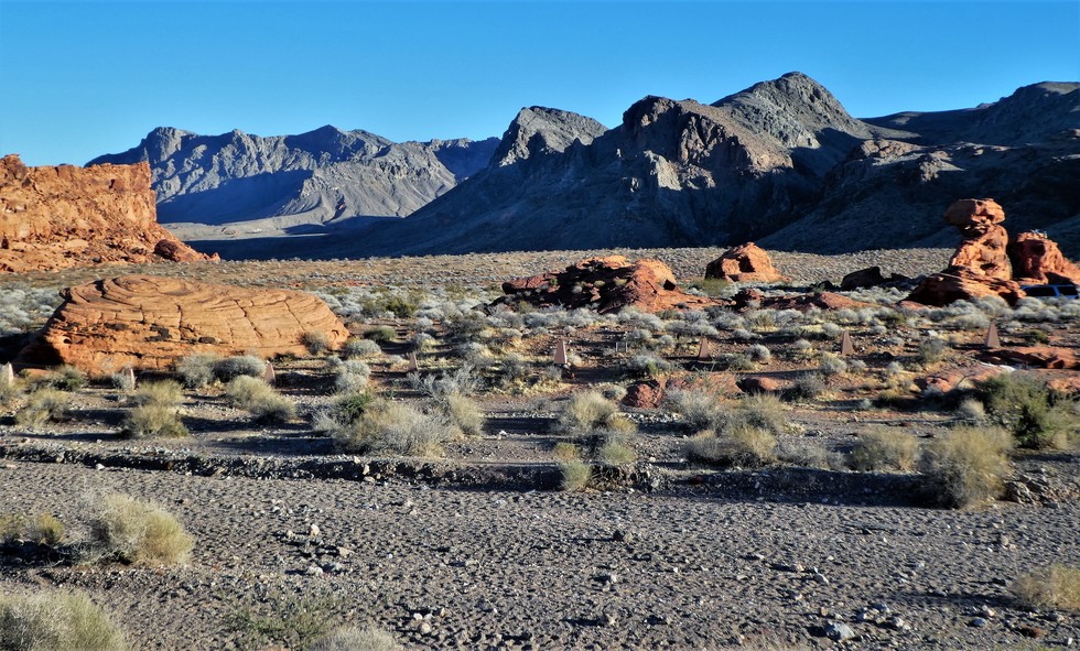 Now we're at the Beehives stop. This is also another campground area. A short path winds through these rocky dunes with hills of the Muddy Mountains visible in the distance. A lot of folks were playing on the rock formations to the right. Muddy Mountains are in the background.