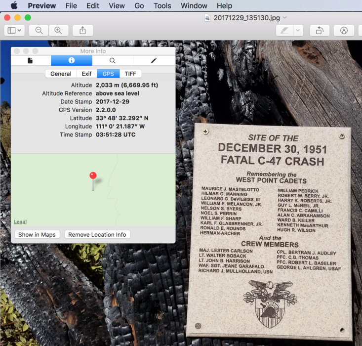 The wreck -- or at least a plaque that says "site of" -- the West Point C-47 has been found by a guy named Glen, who was following my description, got off track and bumped into it. It is located at the top of the gully route above Sawmill Flat. He did not have a GPS, so I gleaned the lat/long from the .jpg's Exif data and posted here with his permission.