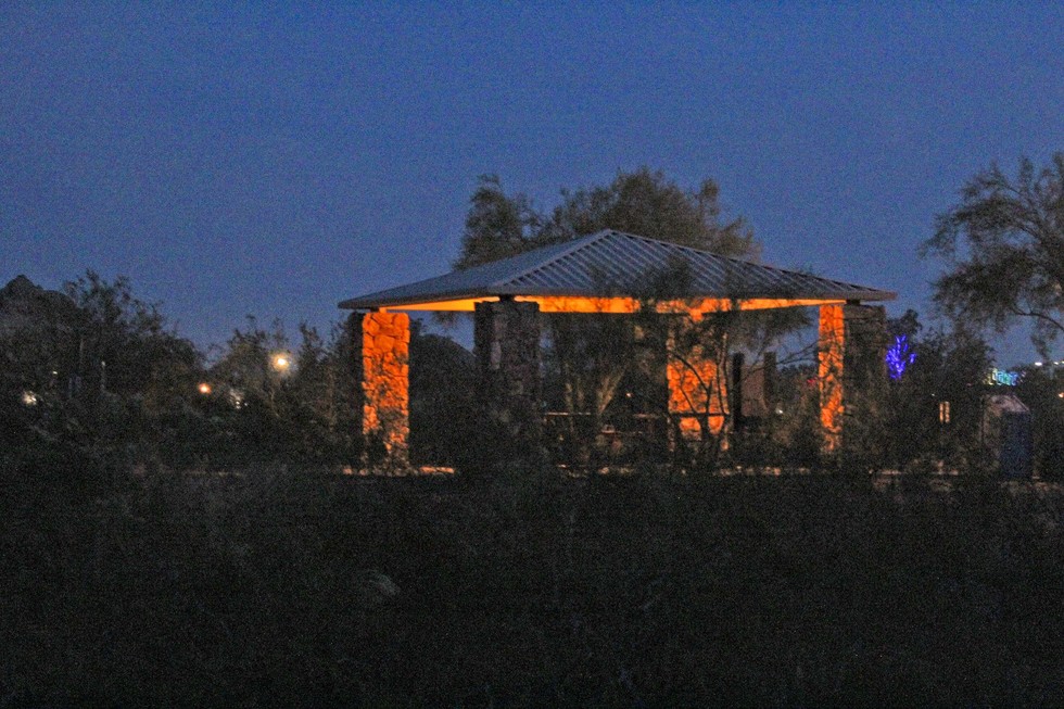 Returning in the dark, a welcome sight. Trailhead ramada lit up.