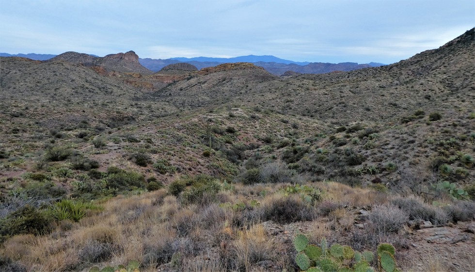 Now I'm on new trail for me as the farthest I had hiked was to the wash. This is looking back and to the NE. You can see Dripping Spring Mountains with the Pinals in the far background. Great views today and really all along our hike.