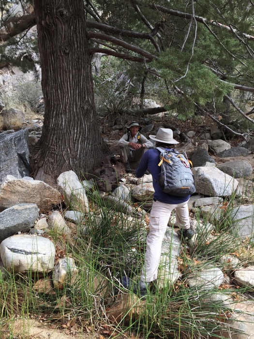 Mike taking a photo of Frank by an old motor, next to a Cypress tree