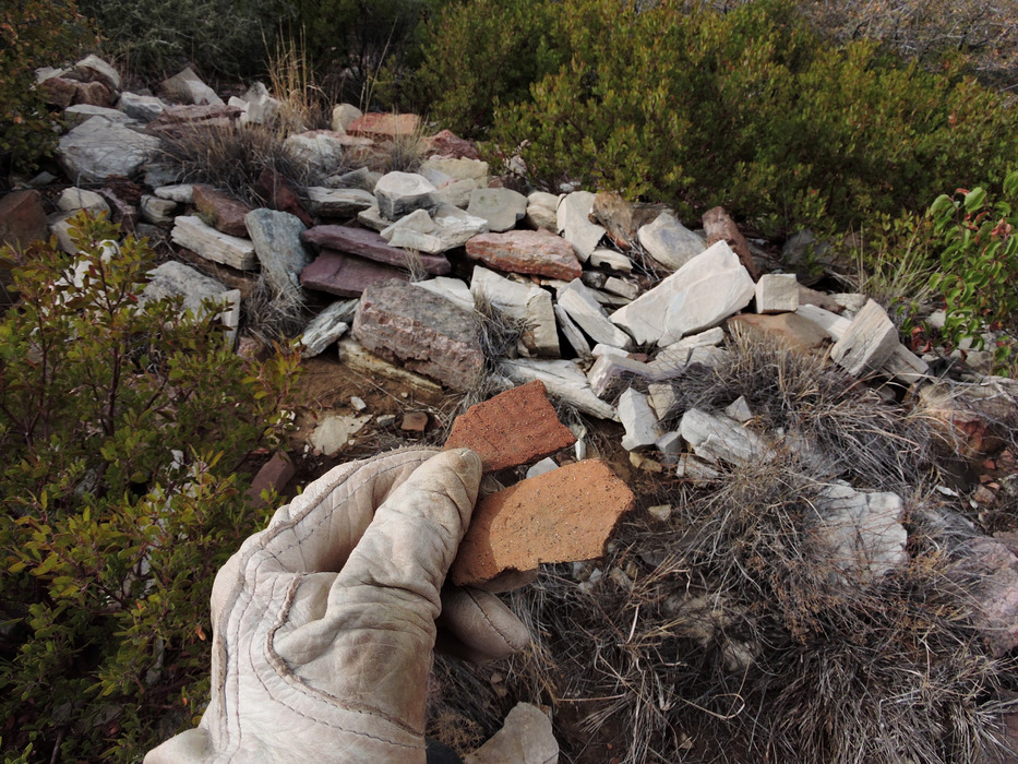 Lots of pottery sherds scattered around inside and outside the ruin. We only saw the corrugated red type shown in this photo and a plain red ware type with smooth surfaces. The presence of so many pottery sherds supports this ruin being of ancient Indian origin and not a ranch corral.