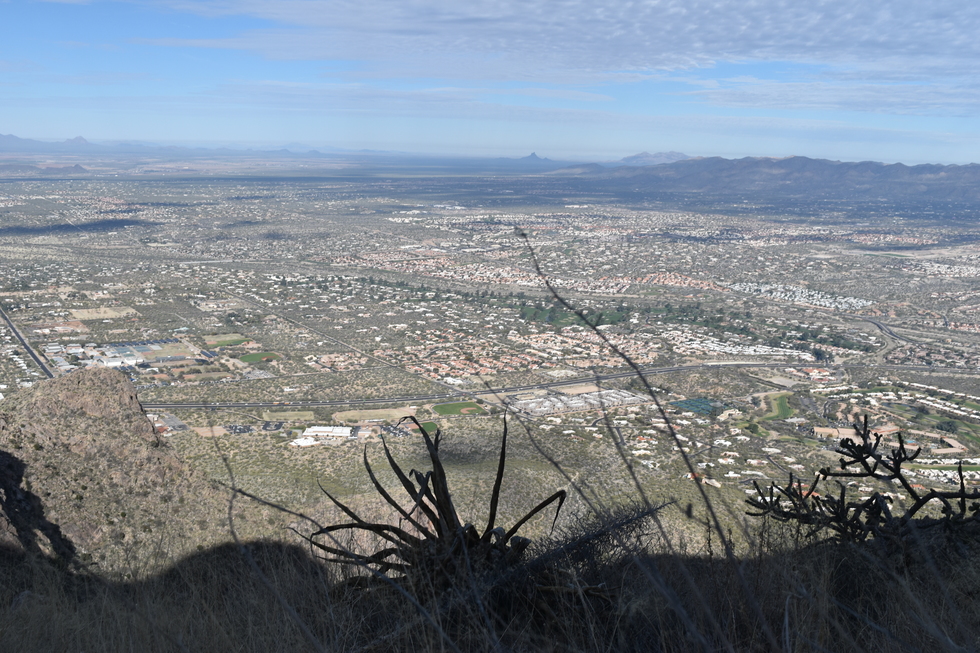 Highway 77, Oracle Road below. El Conquistador Resort on lower right, Tortolita Mountains in back and way in the distance Picacho Peak and Newman Peak. Interstate 10 goes between those two peaks. This picture was taken just below the summit so the valley floor is about 2500 feet below and almost straight down.