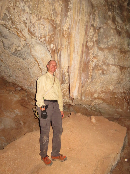 This big flow marks the major junction in the cave, from which a leg juts off to the right of the cameraman. The main cave continues on behind me.
