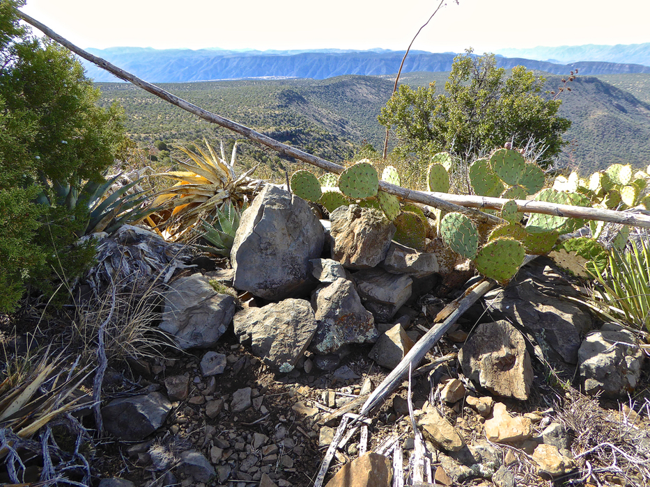 Behind the boulders and below the protective prickly pear is the next benchmark.