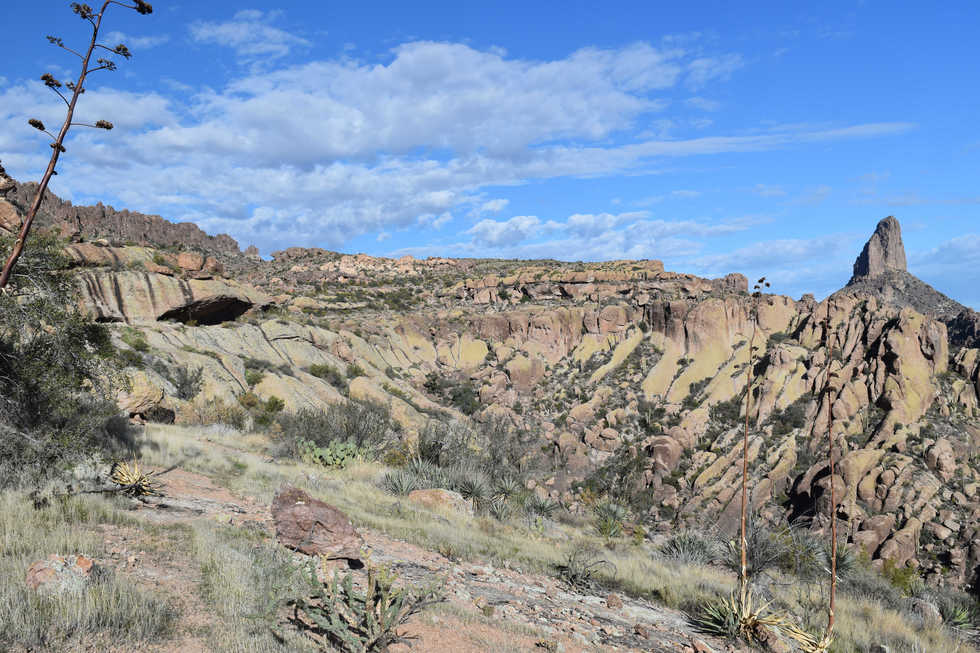 Small cave on the northeast side of the Fortress. I followed the rock cairns along the east side of the fortress to the cave and then lost them. I believe they continued up to the top of the cave and then over to connect up with the main route of the cave Trail that follows along the west side of the Fortress.