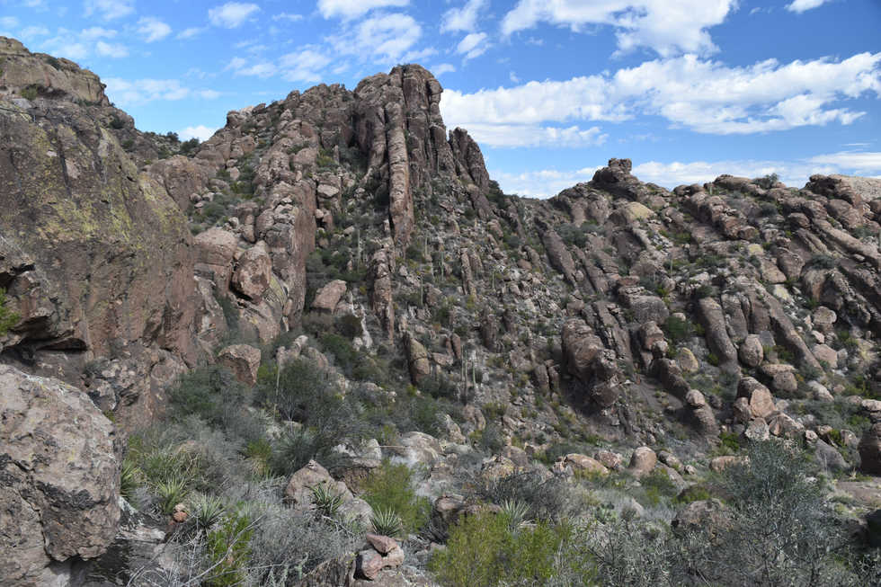 Spotting the Rock cairns is important, There are lots of cliffs and drop offs and someone has already located the best route around them. The cairns are plentiful if you don't see one you are probably off trail. Kind of like finding Waldo except it's finding cairns. I see four in this photo.