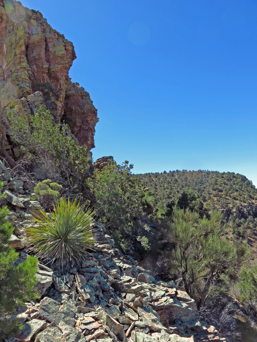 We hiked up this rock slide spine section (on peak right side) to take a look at an opportunity for a cliff side traverse starting here, but we needed to back down this rock slide about 35 yards then start our bushwhack, parallel traverse up to the cliff face