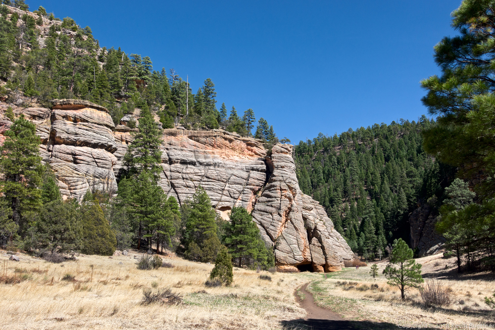 This rock formation is encountered when entering Walnut Canyon from Sandy's Canyon. The trail passes by the cave visible at the bottom right of the formation.